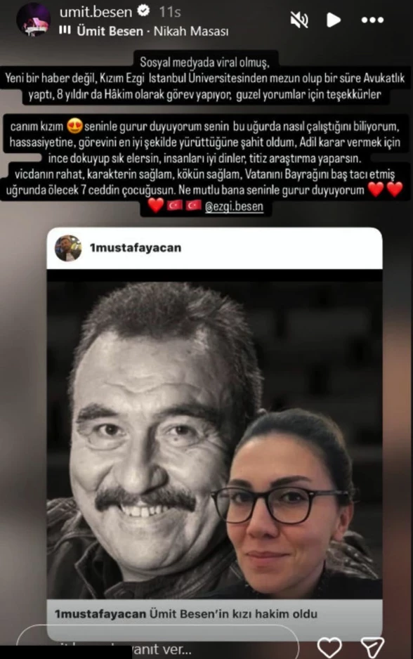“Sosyal medyada viral olmuş, yeni bir haber değil. Kızım Ezgi İstanbul Üniversitesi’nden mezun olup bir süre avukatlık yaptı, 8 yıldır da hâkim olarak görev yapıyor. Güzel yorumlar için teşekkür ederim.”